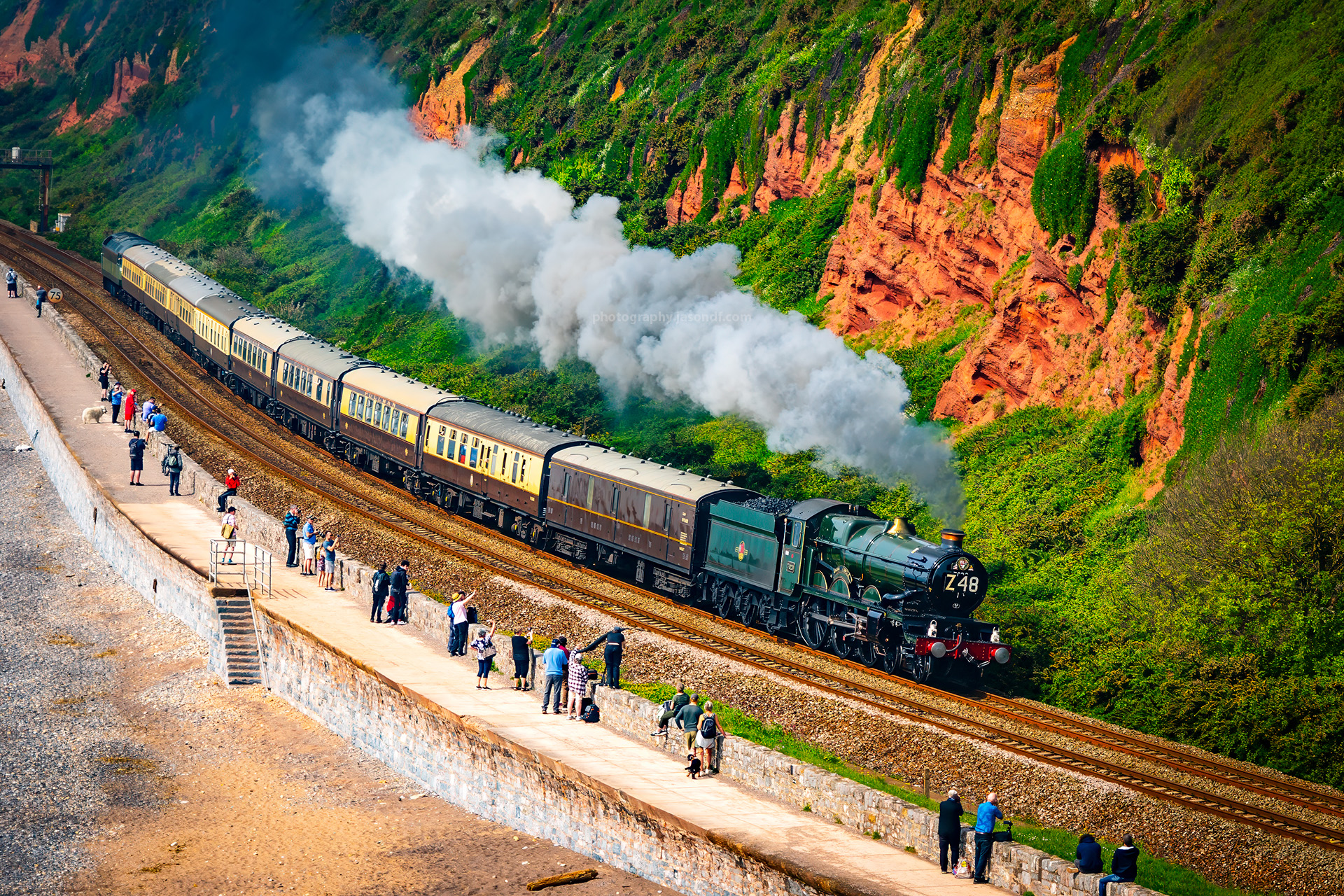 Clun Castle passing Red Rock on Dawlish Sea Wall on 11th May 2024 running from 1Z48 Plymouth to Bristol.